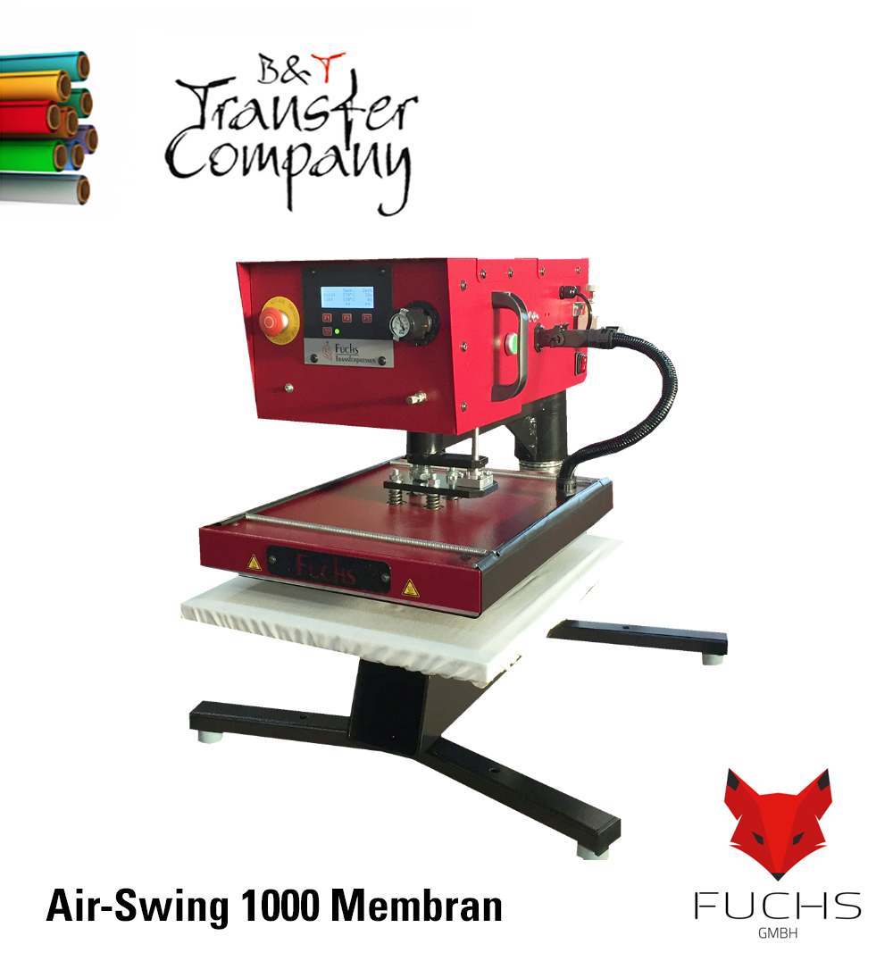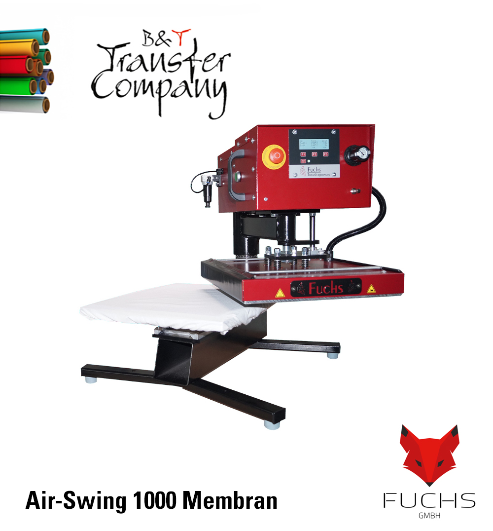 Um den Pressvorgang bei der pneumatischen Membranpresse Air-Swing 1000 membran auszulösen, müssen aus Sicherheitsgründen zwei Drucktaster gleichzeitig solange gedrückt werden, bis die Heizplatte auf der Arbeitsplatte bzw. Membranplatte aufliegt (2Hand-Sicherheitsschaltung). Während des Pressvorgangs füllt sich das Membrankissen mit Luft und drückt sich somit gleichmäßig gegen die Heizplatte. Nach Ablauf der eingestellten Zeit entweicht zuerst die Luft aus dem Membrankissen und anschließend öffnet die Transferpresse wieder automatisch. Das Schwenken erfolgt manuell. Der Anpressdruck kann exakt über einen Druckregler eingestellt werden.