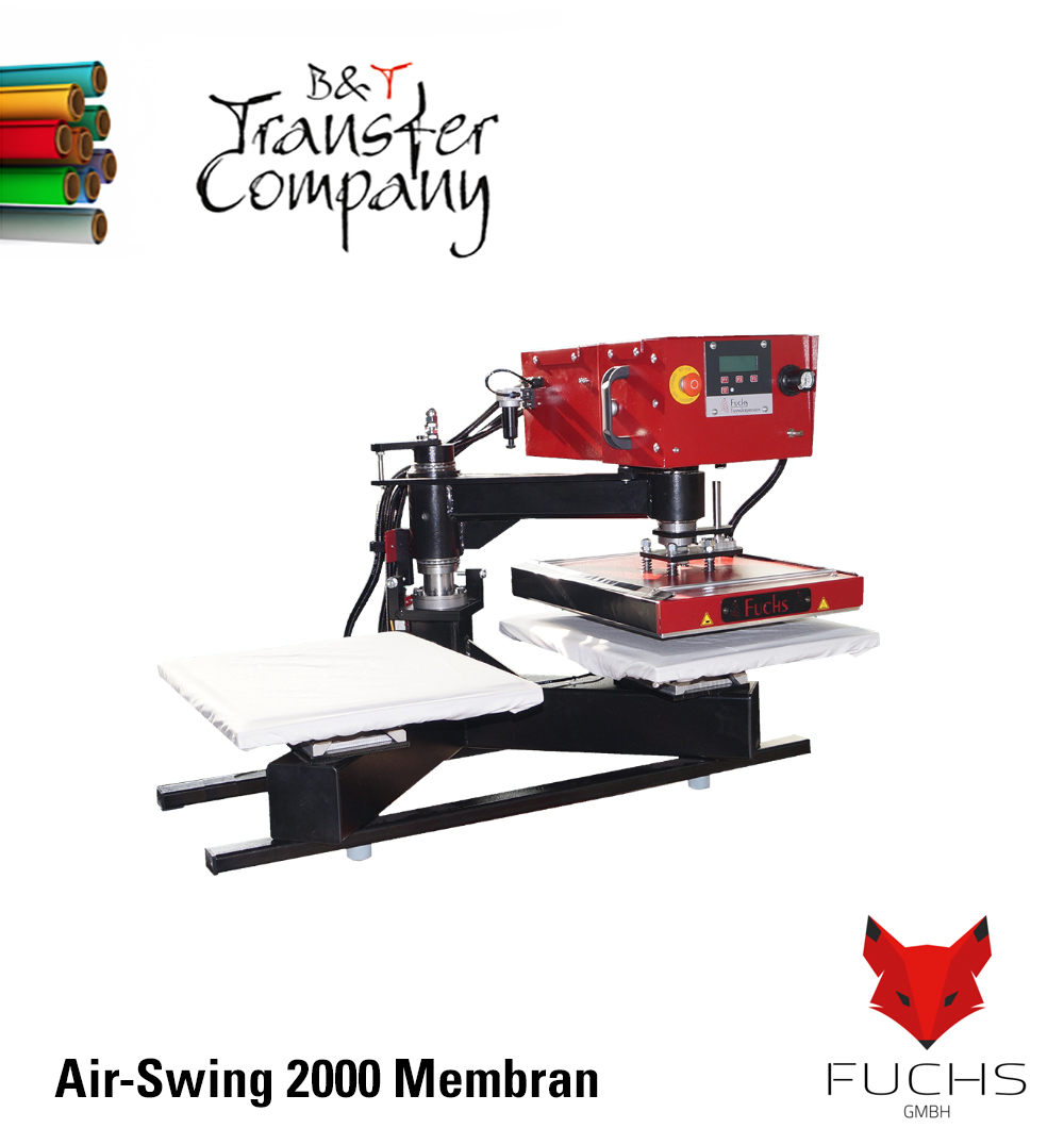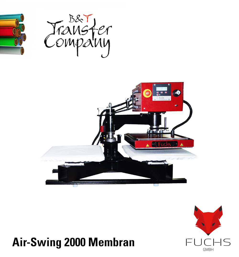 Um den Pressvorgang bei der pneumatischen Membranpresse Air-Swing 2000 membran auszulösen, müssen aus Sicherheitsgründen zwei Drucktaster gleichzeitig solange gedrückt werden, bis die Heizplatte auf der Arbeitsplatte bzw. Membranplatte aufliegt (2Hand-Sicherheitsschaltung). Während des Pressvorgangs füllt sich das Membrankissen mit Luft und drückt sich somit gleichmäßig gegen die Heizplatte. Nach Ablauf der eingestellten Zeit entweicht zuerst die Luft aus dem Membrankissen und anschließend öffnet die Transferpresse wieder automatisch. Das Schwenken erfolgt manuell. Der Anpressdruck kann exakt über einen Druckregler eingestellt werden.