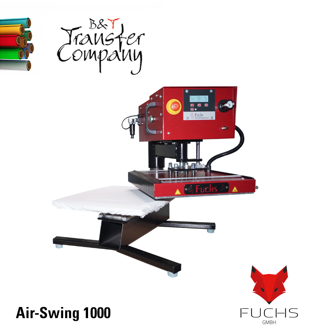 Um den Pressvorgang bei der pneumatischen Transferpresse Air-Swing 1000 zu starten, müssen aus Sicherheitsgründen zwei Drucktatser gleichzeitig solange gedrückt werden bis die Heizplatte auf der Arbeitsplatte aufliegt (2Hand Sicherheitsschaltung). Nach Ablauf der eingestellten Zeit öffnet die Transferpresse automatisch. Die Maschine besitzt auch eine manuelle Vor- bzw. Nachpress-Funktion. Das Schwenken erfolgt manuell. Der Anpressdruck kann exakt über einen Druckregler eingestellt werden.